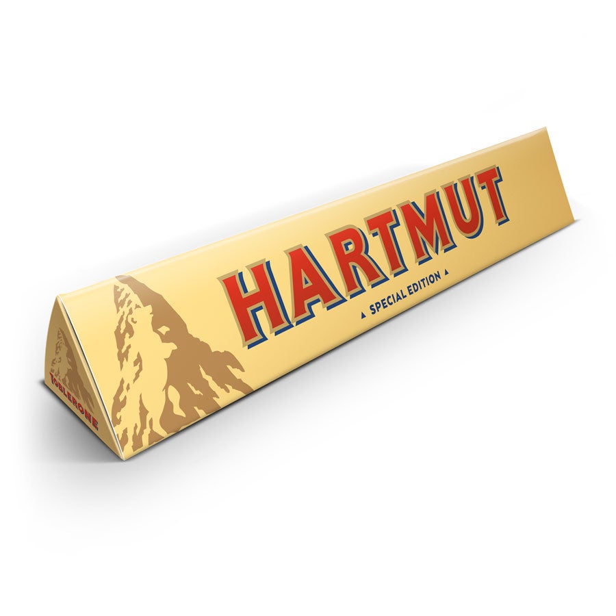 Una barra de chocolate Toblerone XXL (4,5 kg) con envoltorio personalizado con el nombre que desees. Chocolate con leche con miel y almendras de Suiza.